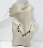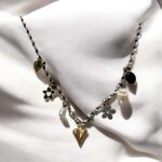 Łańcuszek na czarnym sznureczku z zawieszkami serduszko, kwiatuszki, perełka i czarny kamyczek