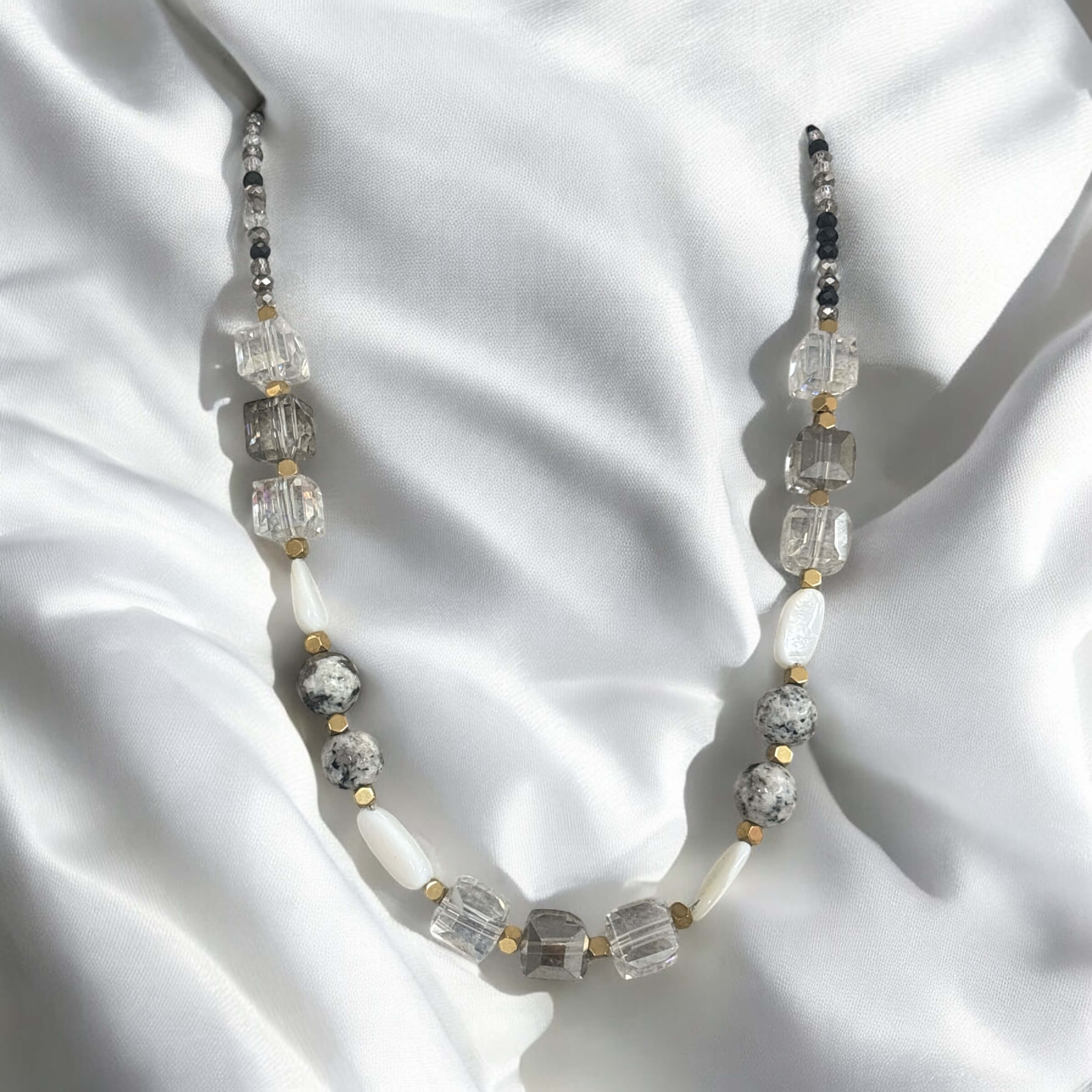 Wprowadź do swojej kolekcji biżuterii elegancki łańcuszek, który łączy w sobie prostotę z nowoczesnym stylem. Ten naszyjnik biało-szare koraliki i kryształki z biało-czarnym łańcuszkiem, doda blasku każdej stylizacji i stanie się ulubionym dodatkiem na co dzień oraz na wyjątkowe okazje.