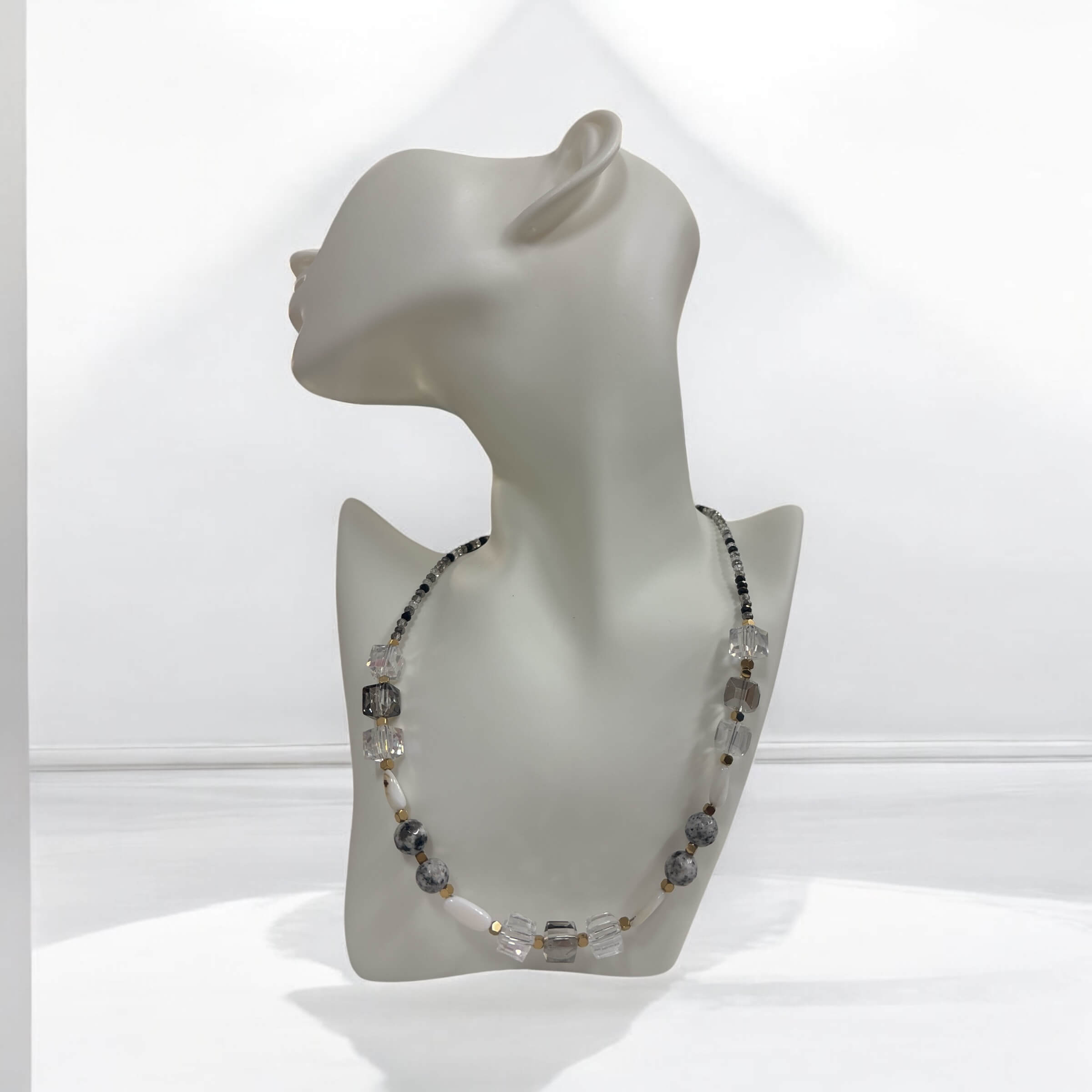 Naszyjnik biało-szare koraliki i kryształki z biało-czarnym łańcuszkiem