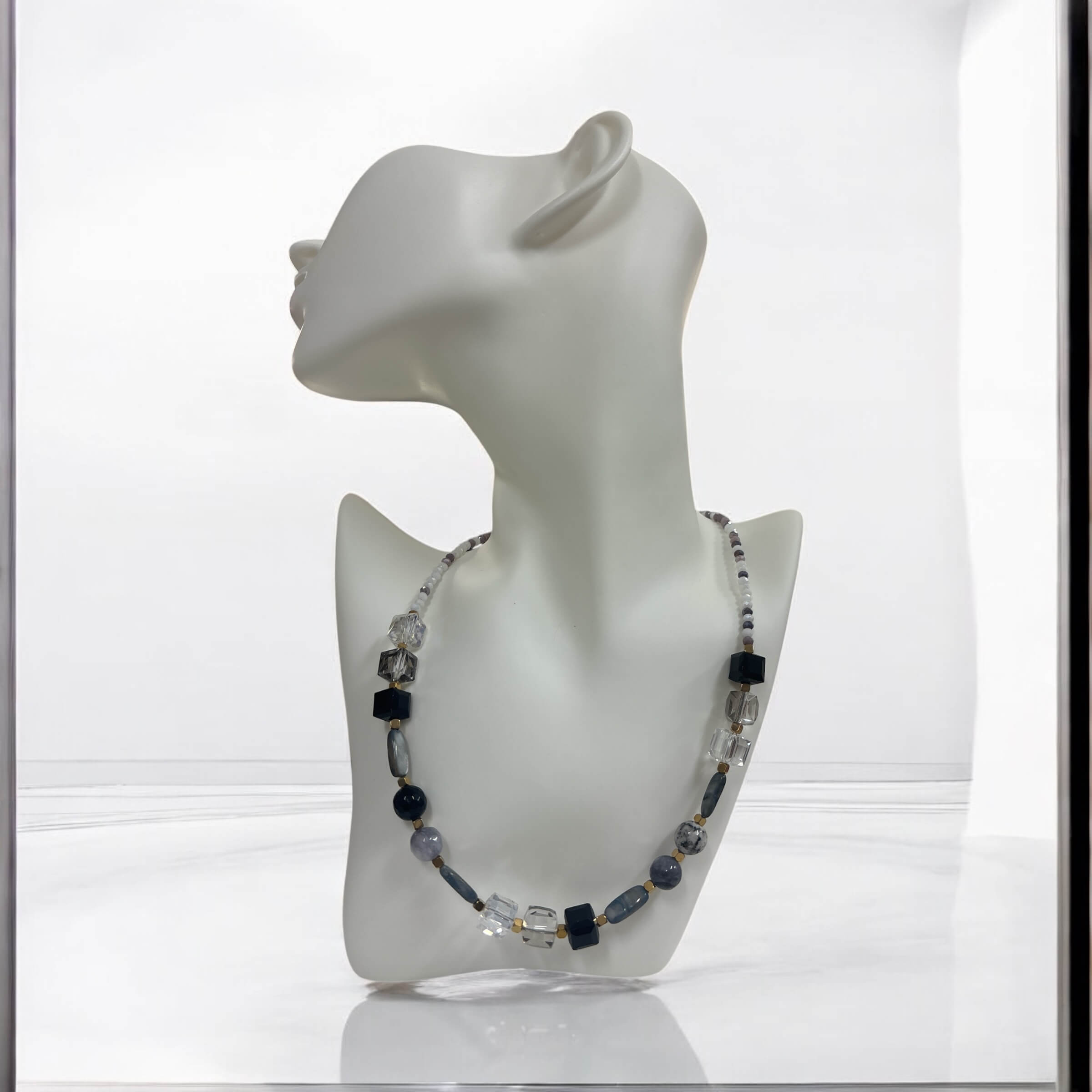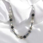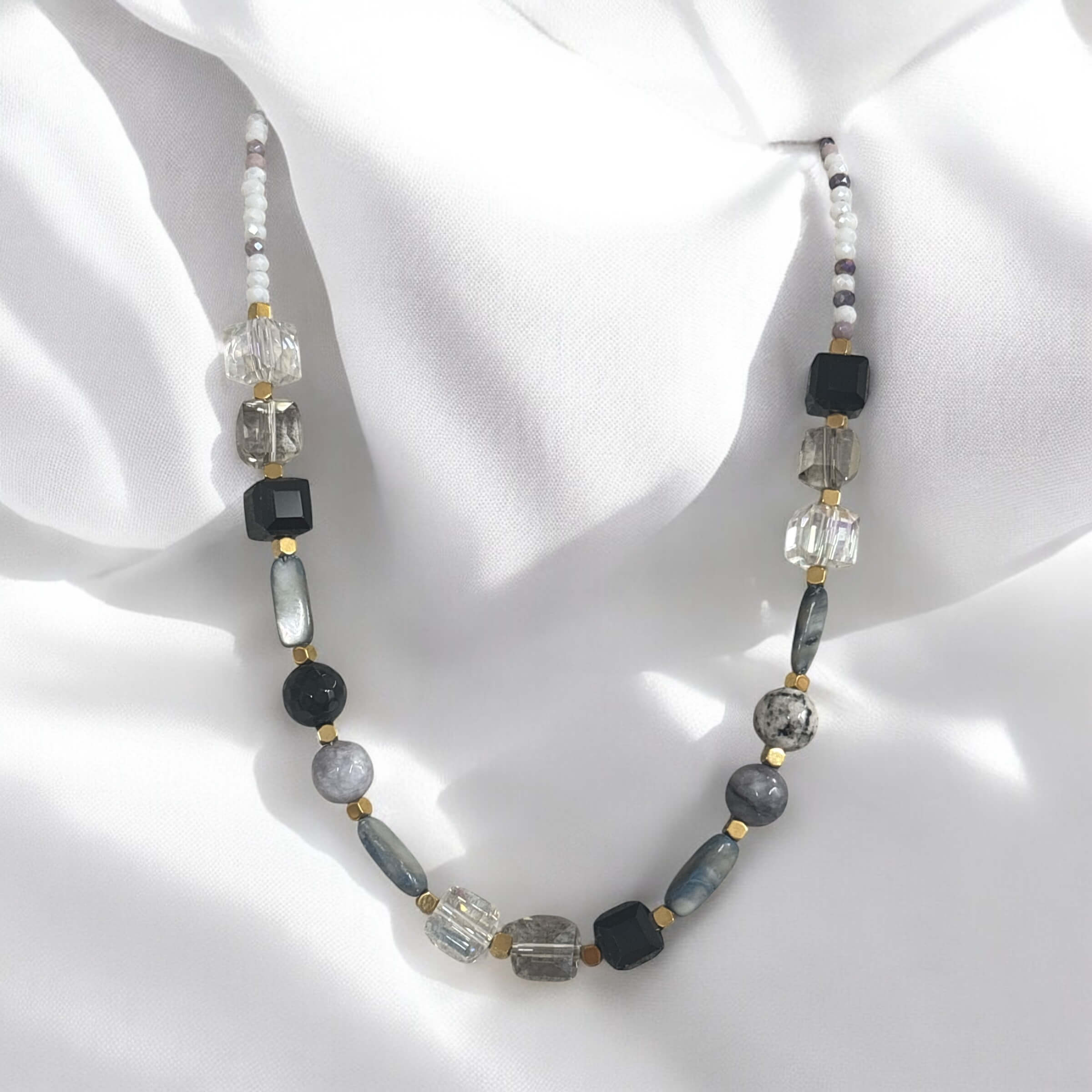 Naszyjnik biało-szare koraliki i kryształki z biało-czarnym łańcuszkiem