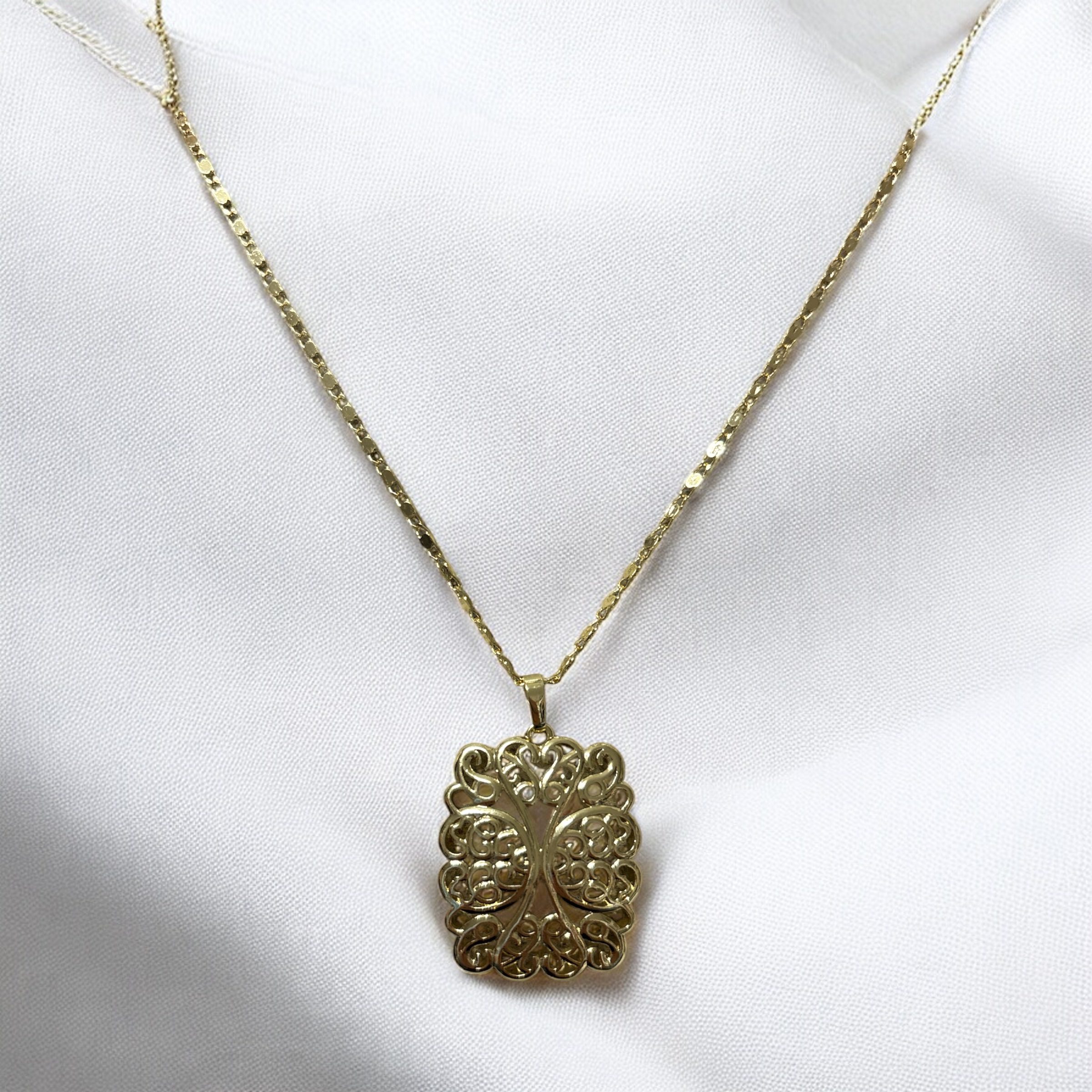Ażurowy prostokąt to minimalistyczny, ale efektowny element, który przyciąga wzrok. Jego prosta forma sprawia, że łańcuszek doskonale komponuje się z różnorodnymi stylizacjami. Możesz go nosić zarówno z casualowymi, jak i bardziej eleganckimi outfitami, co czyni go wszechstronnym dodatkiem.
