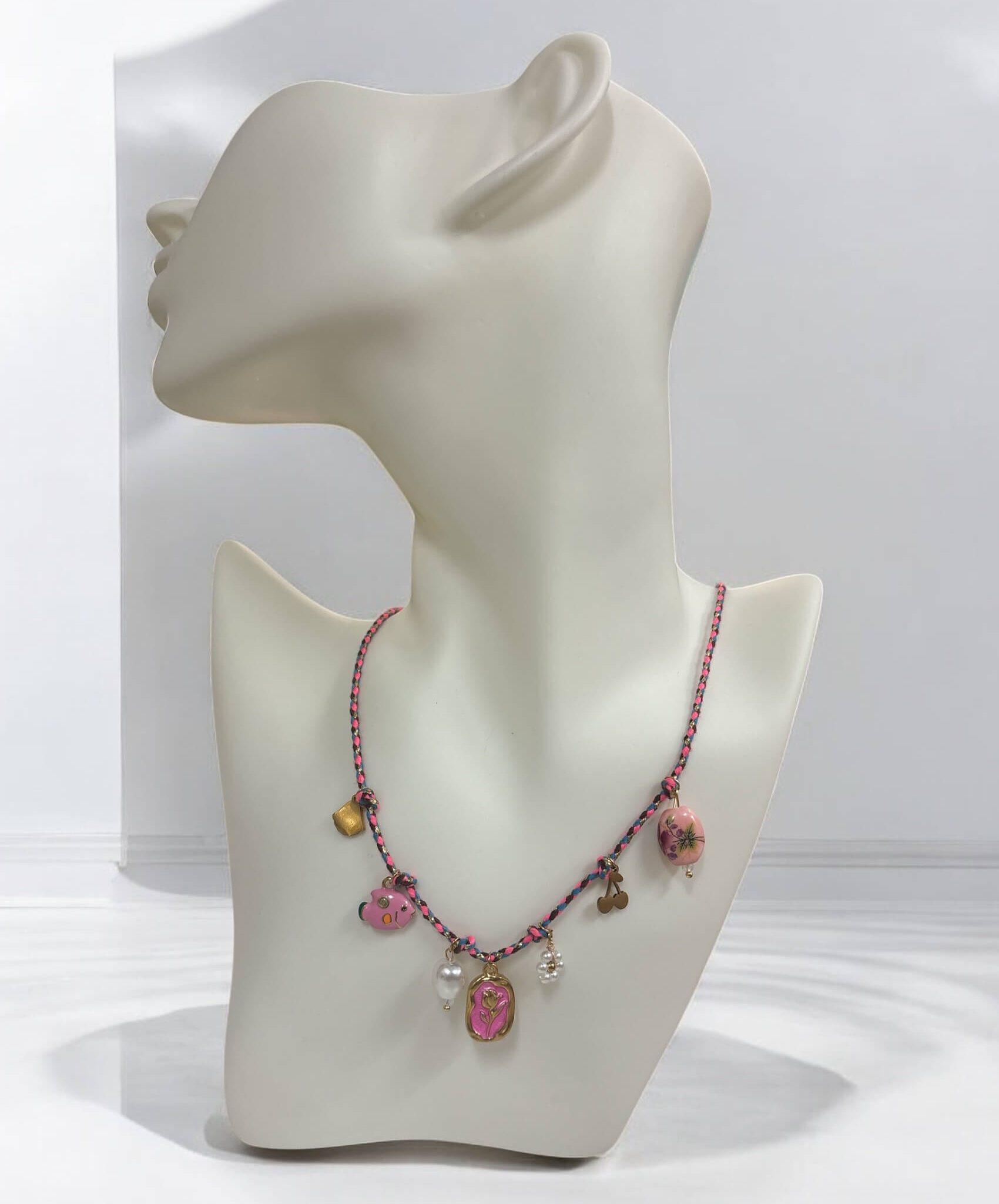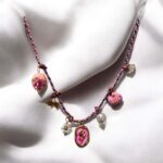 Łańcuszek na różowym sznureczku z zawieszkami róża, rybka, wisienki, kwiatuszek, perełki i kamyczki