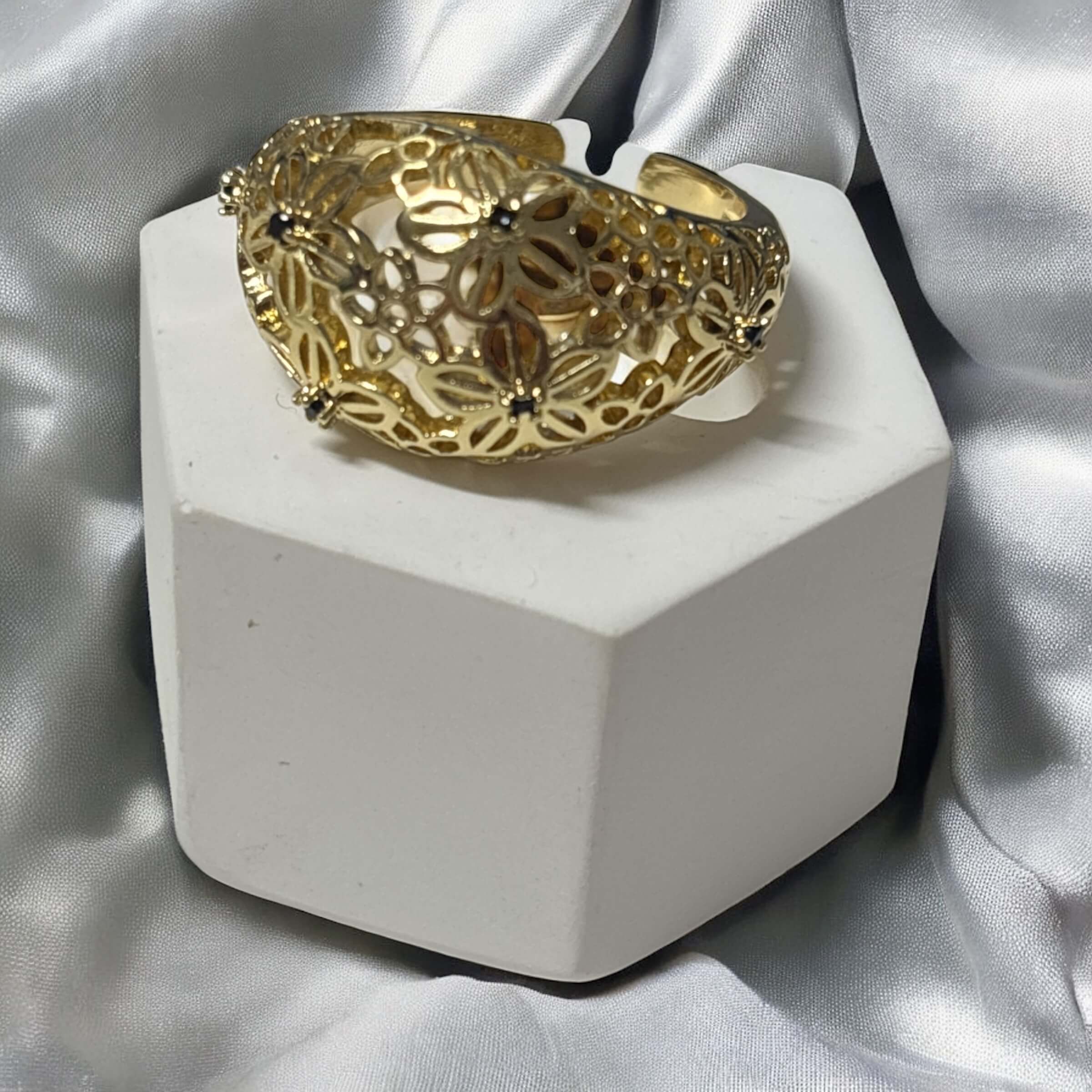 Pierścionek Złoty Stal ażurowe kwiatuszki z czarnymi cyrkoniami