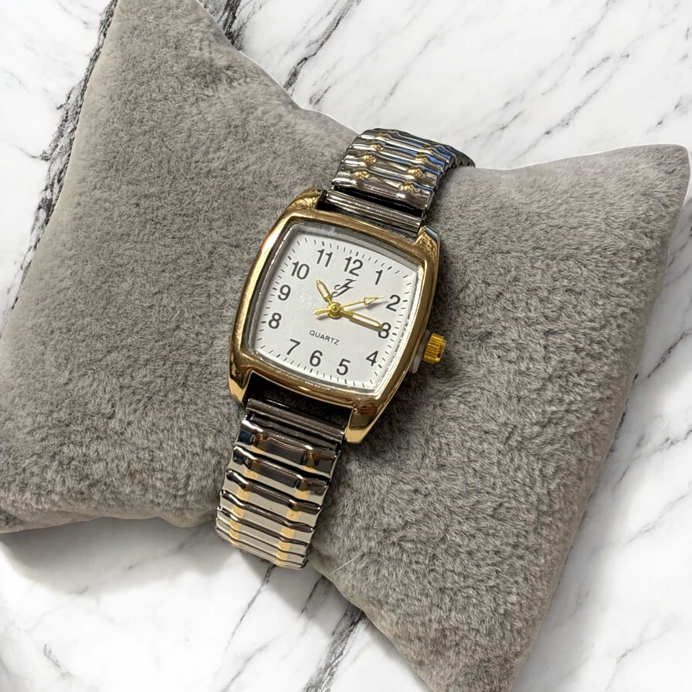 Zegarek damski w kolorze złotym, na bransolecie. Tarcza w kolorze srebrno-złotym.