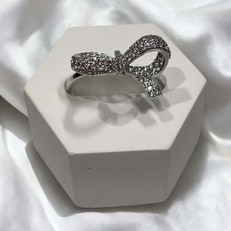Pierścionek regulowany srebrna stal chirurgiczna kokarda z cyrkoniami