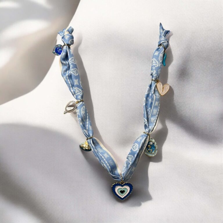 Naszyjnik na niebieskiej tasiemce z zawieszkami