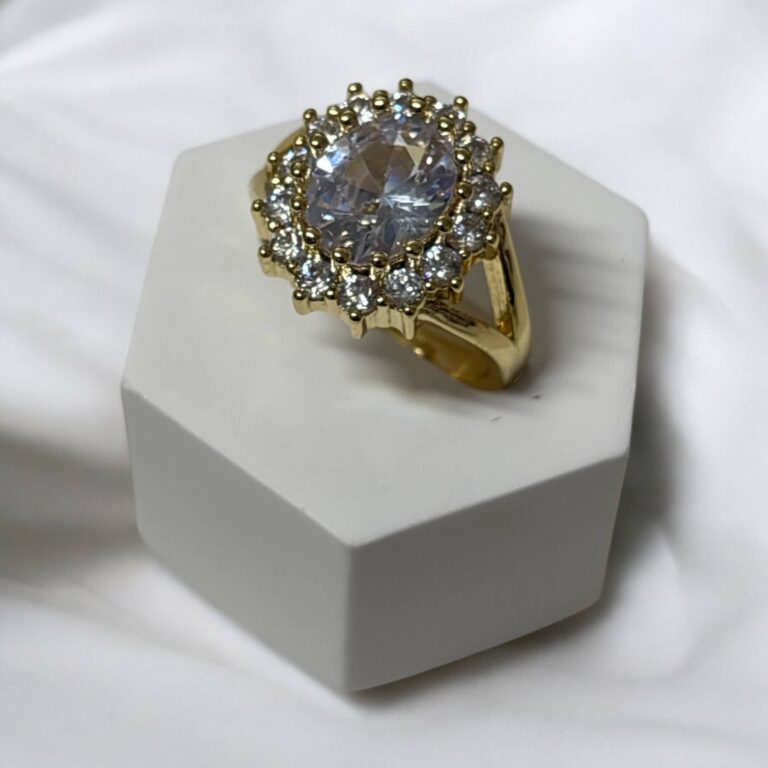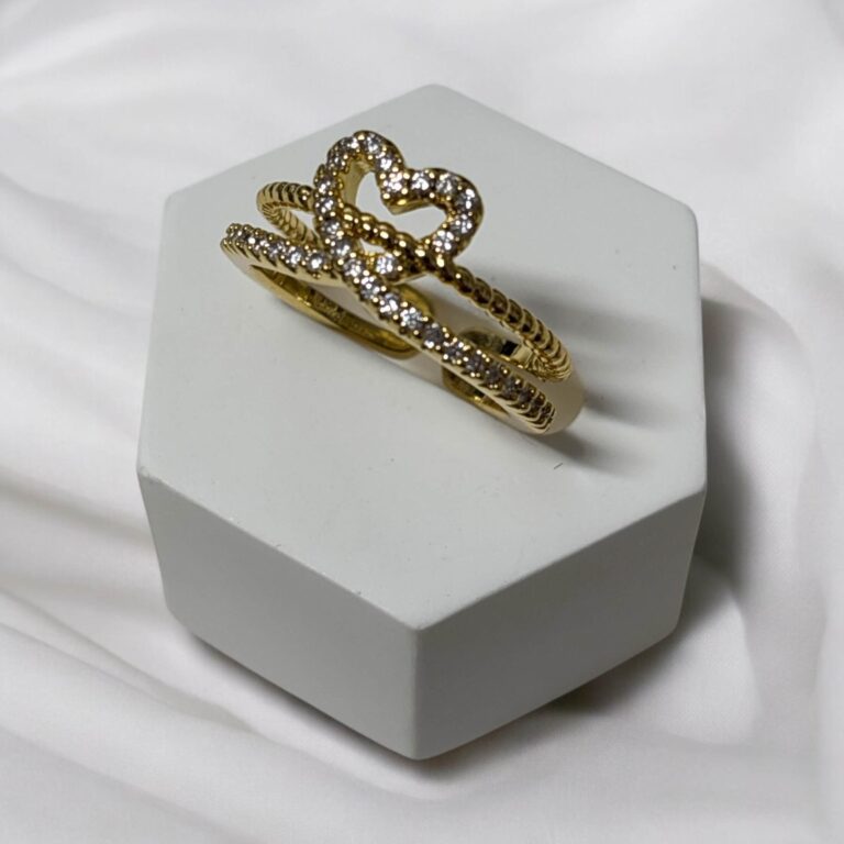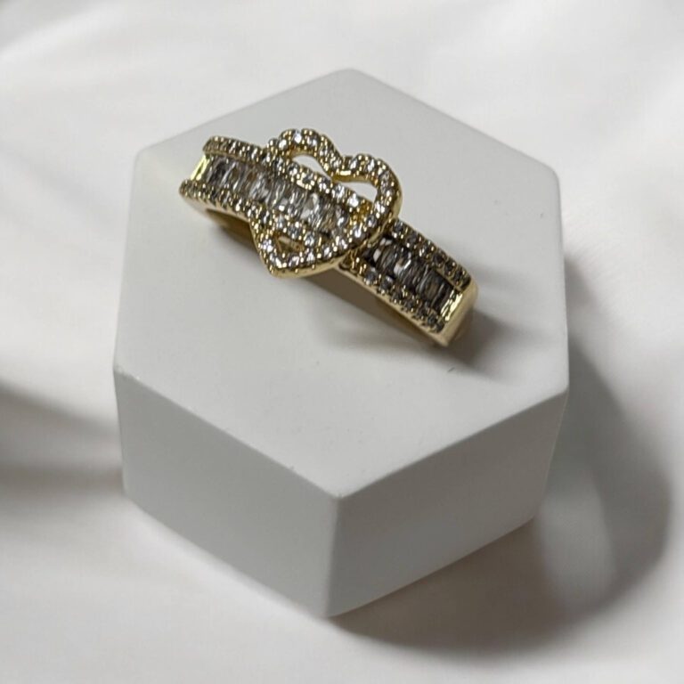 Pierścionek złoty stal chirurgiczna gruby ażurowe kwiatuszki z białymi cyrkoniami