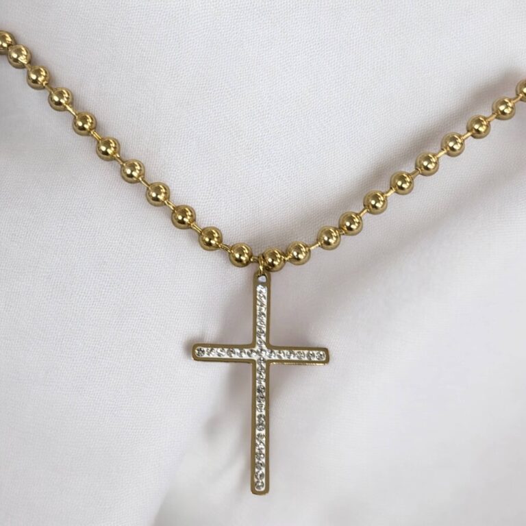 Naszyjnik stal chirurgiczna złoty krzyżyk na kuleczkowym łańcuszku