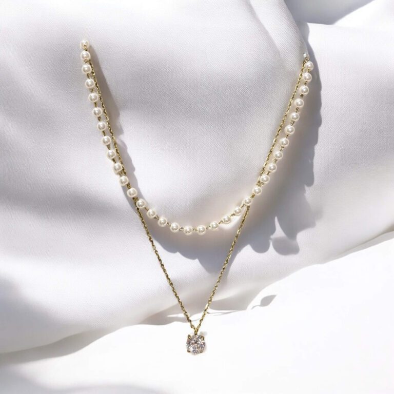 Naszyjnik stal chirurgiczna złoty podwójny perełki z kryształkiem