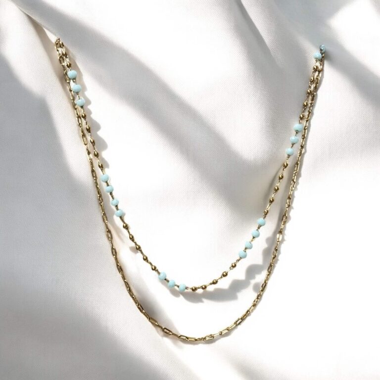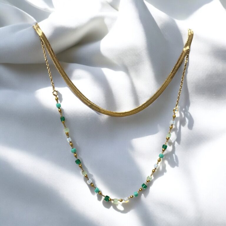 Naszyjnik stal chirurgiczna złoty podwójny zozo i zielono-białe koraliki