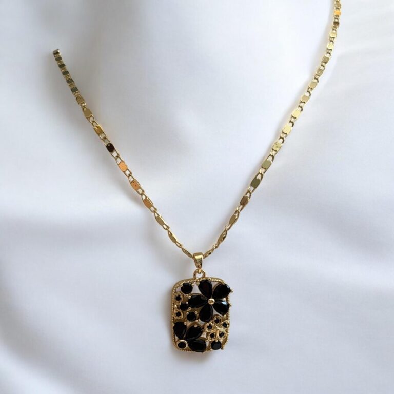 Naszyjnik stal chirurgiczna złoty prostokąt z czarnymi kryształowymi kwiatuszkami