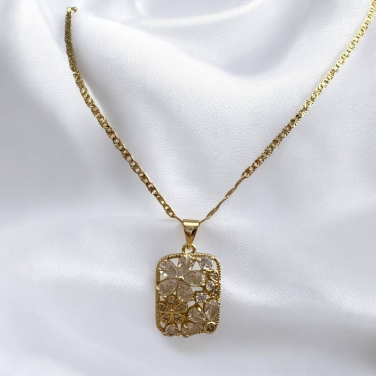 Naszyjnik stal chirurgiczna złoty prostokąt z białymi kryształowymi kwiatuszkami